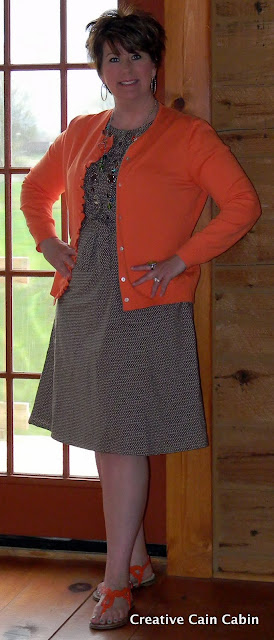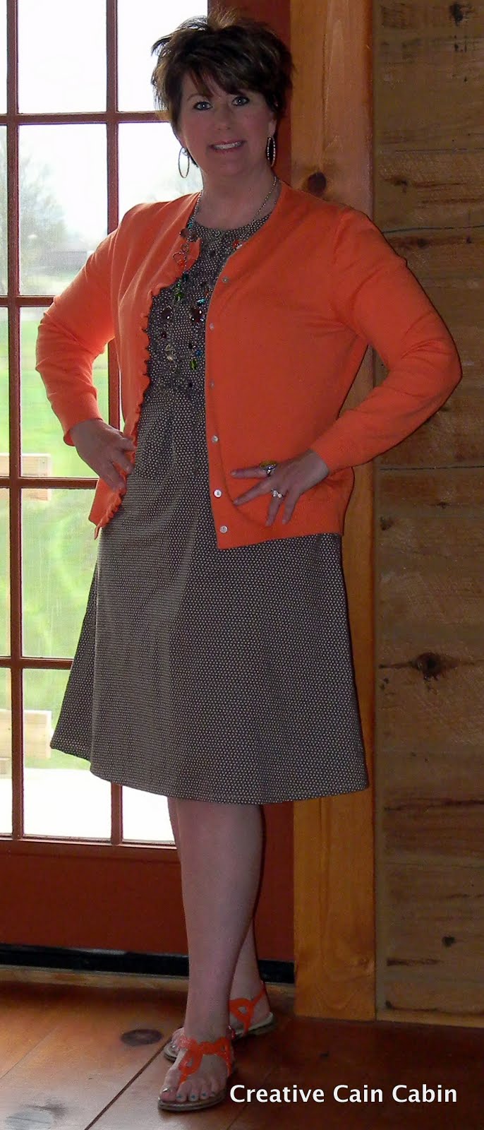 I love your thrifted dress paired with the orange cardigan. That pop of color is so welcomed and unexpected. Looks great.